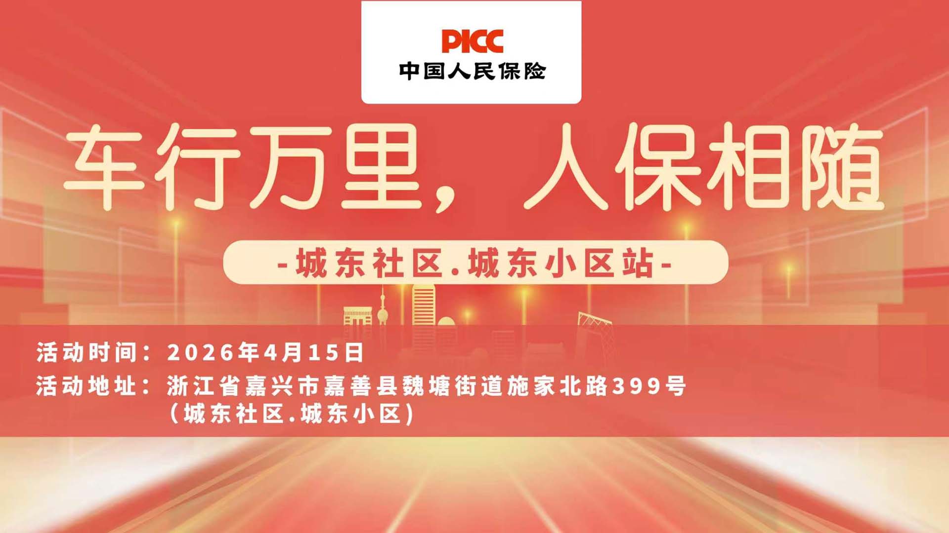 2026年4月15日,中国人民财产保险股份有限公司长三角一体化示范区(浙江)支公司将走进城东社区.城东小区,开展“车行万里,人保相随”专项活动。资深顾问现场免费答疑,细致讲解车险知识、测算续保金额、明确保障内容,根据不同用车需求定制合理方案,让投保更清晰、用车更放心。